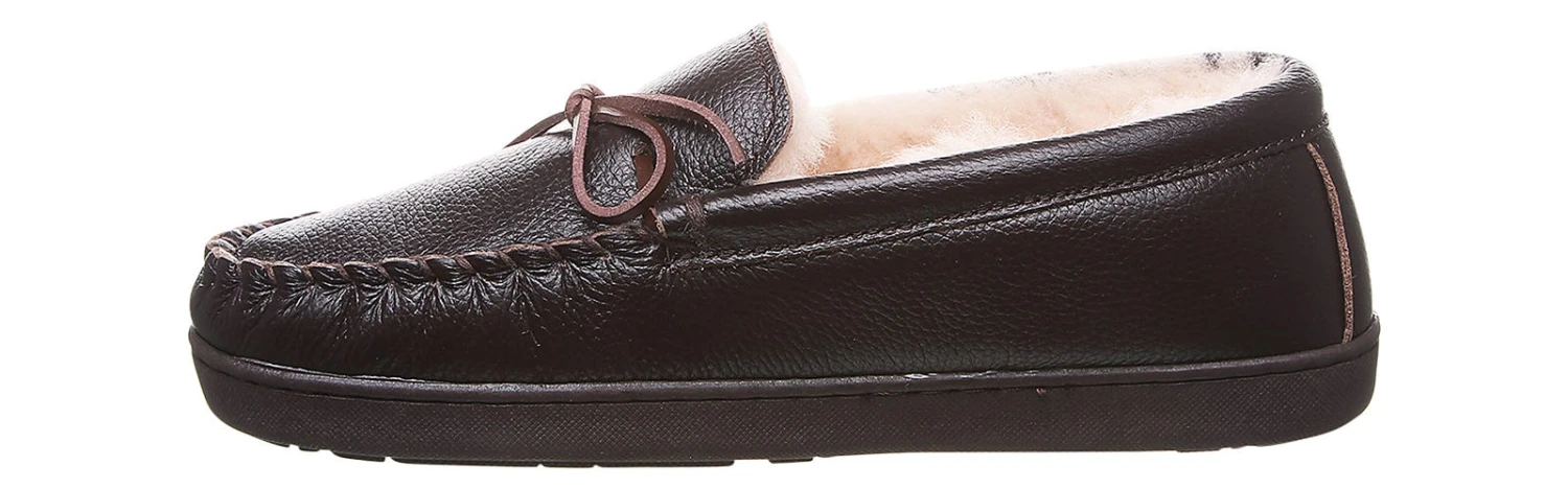 You will look sophisticated in the Men’s Bearpaw Mach IV Brown Leather Slipper. Our most popular men’s slipper now offered in a full grain leather upper offers slip on cozy comfort that will travel with you both indoors and out.