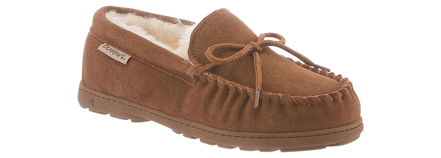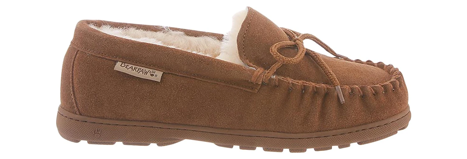 Now available in wide! The Bearpaw Mindy Wide Tan Women’s Moccasin is like the boyfriend slipper made just for women. The Bearpaw Mindy Wide Hickory Tan Women’s Moccasin makes for the perfect night of being warm on the couch. Cozy sheepskin lining helps keep your feet warm and makes those long winters a little more bearable.