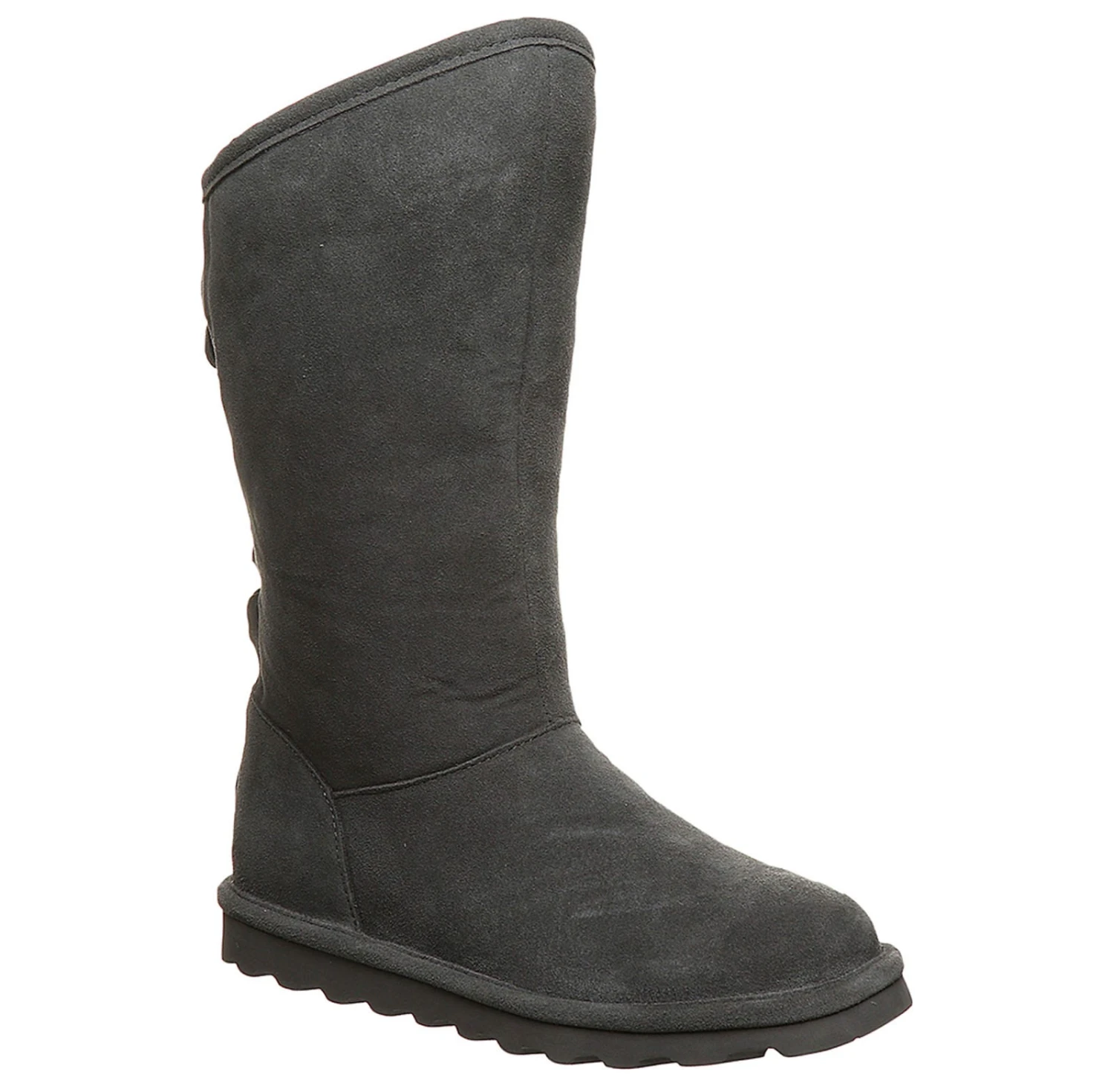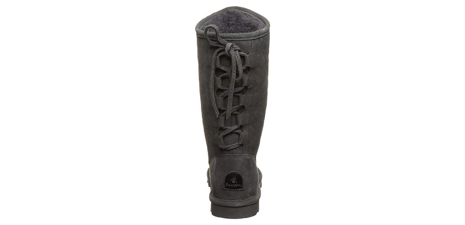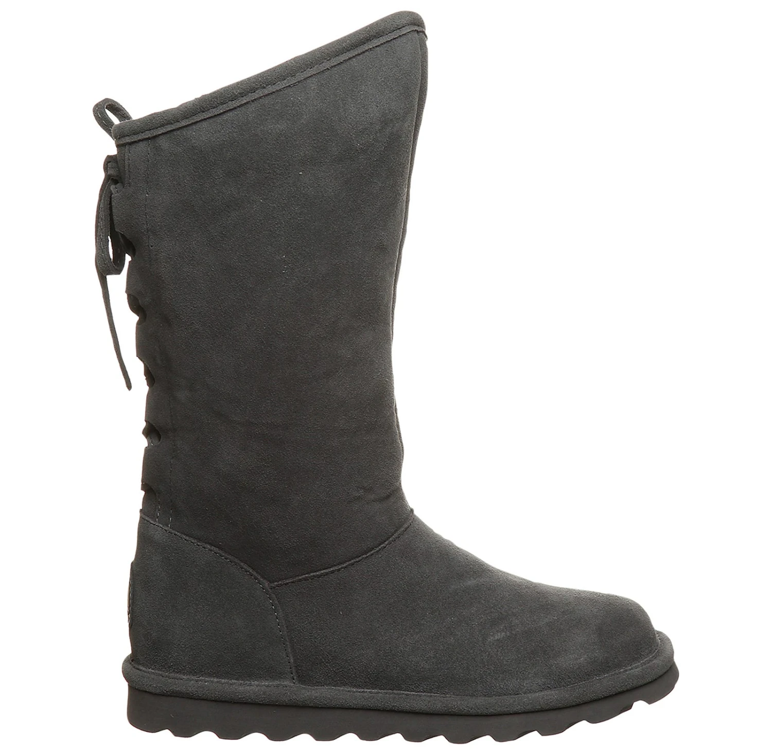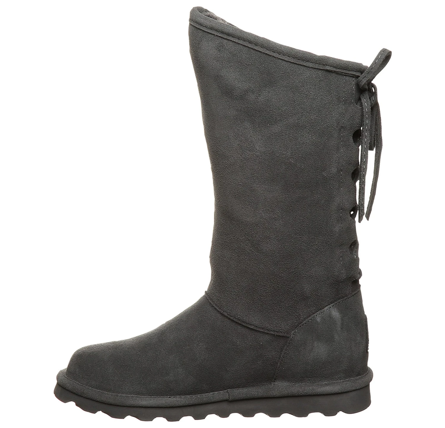 The Women’s Bearpaw Phylly Grey Back Lace Boot features a ghillie lace up back detail and an angled top collar, bringing added style to this cozy 10-inch-tall classic suede boot. The Bearpaw Phylly Grey Women’s Boot features a sheepskin and wool blend lining that regulates body temperature to keep your feet warm. The footbed provides additional softness and reduces foot fatigue. Treated with NeverWet technology for extra protection from the elements.