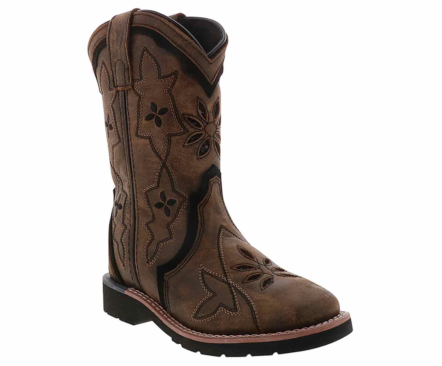 Your little one will feel like a cowgirl in the Dan Post Posy Girls’ (4-6) Western Boot! This square-toe style shoe features a 1-inch heel, leather upper, and a durable outsole. This unique design has flower embellishments and sequins. The inside includes a cushioned insole, padded inside and pull tabs. Dan Post Posy Girls’ (4-6) Western Boot will be her new favorite shoe!