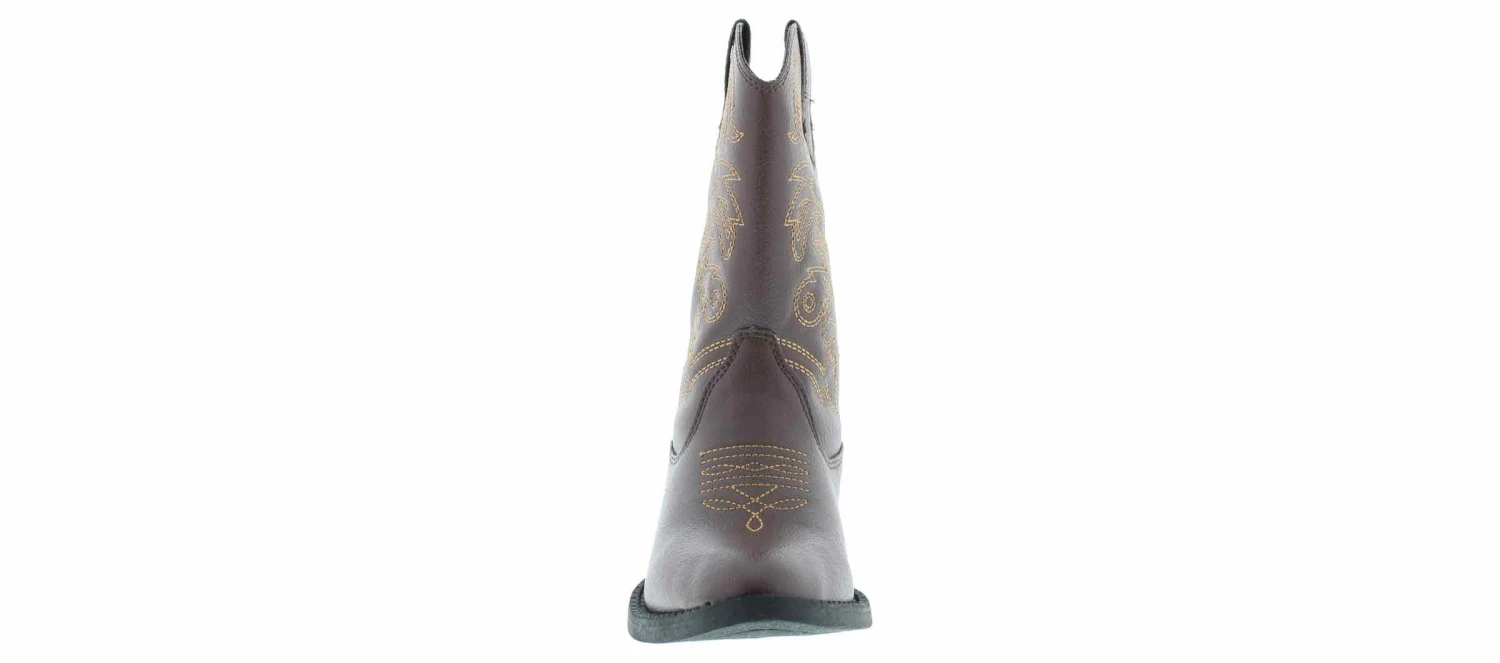 Featuring an Easy care synthetic upper with embroidered stitch detail, the Deer Stags Ranch Boys’ Western Boot will help him get all his work done. The rich synthetic leather upper is embroidered in a classic western style. This boot pulls up past your child’s ankles to keep them warm and cozy. The padded insole keeps your child comfortable to run around. This boot has pull on straps and a wide opening that helps get the boots securely on their foot without the hassle. This style is vegan and fully man-made.