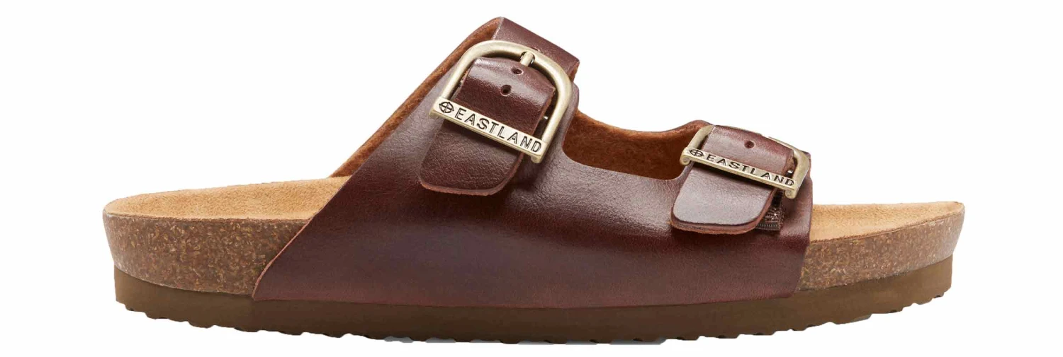 The super comfy Cambridge slide features adjustable straps for a custom fit. Full-grain leather or soft suede straps. Adjustable buckle closure for secure fit. Eastland Exclusive Active Memory Foam comfort insole supports and conforms to the curves of your foot.