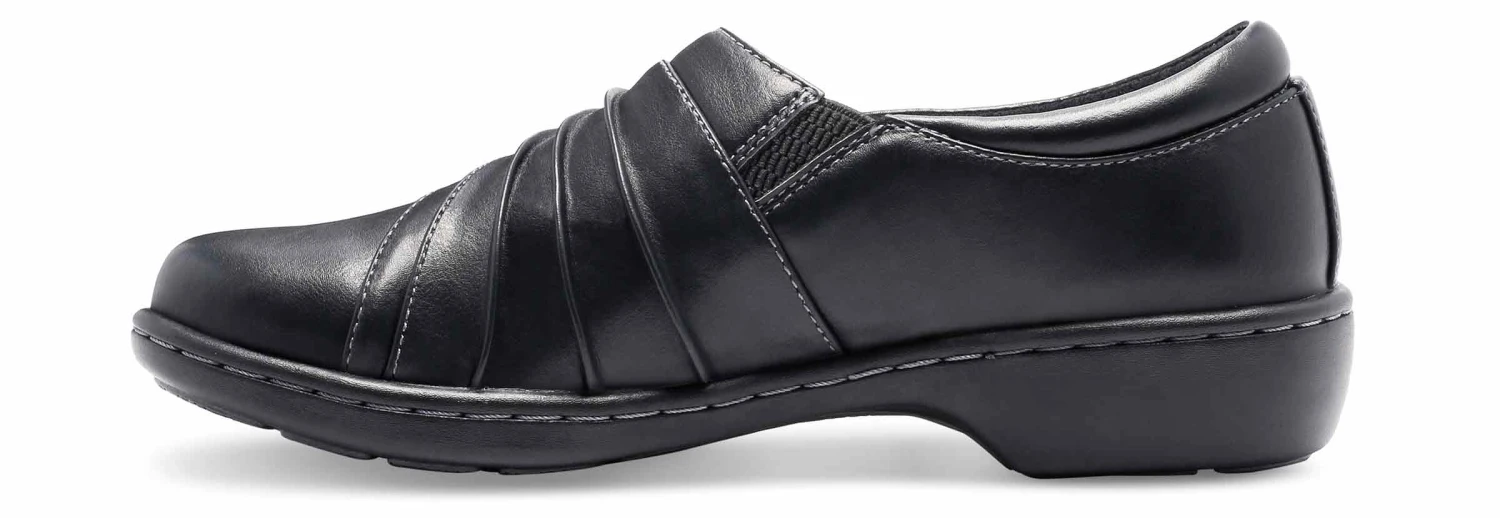 Pleated detailing adds interest to the versatile Eastland Piper slip ons. This style features a synthetic upper with dual elasticized bands for easy on and off styling. The Eastland Piper slip ons have a comfort insole and a shock absorbing PU outsole