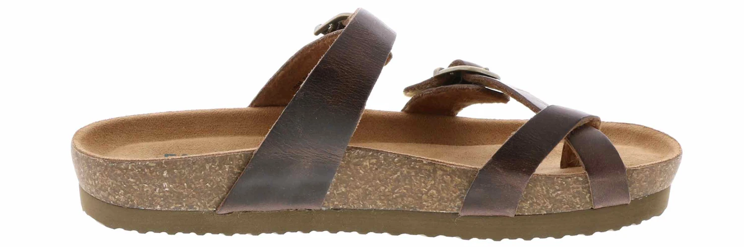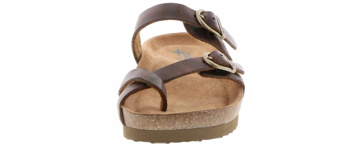 Enjoy easygoing style and comfort in the Eastland Tiogo strappy slide sandals. This style features a soft nubuck leather upper with adjustable buckle straps for a custom fit. The Eastland Tiogo sandals have the Eastland Exclusive Active Memory Foam comfort insoles for all day comfort.