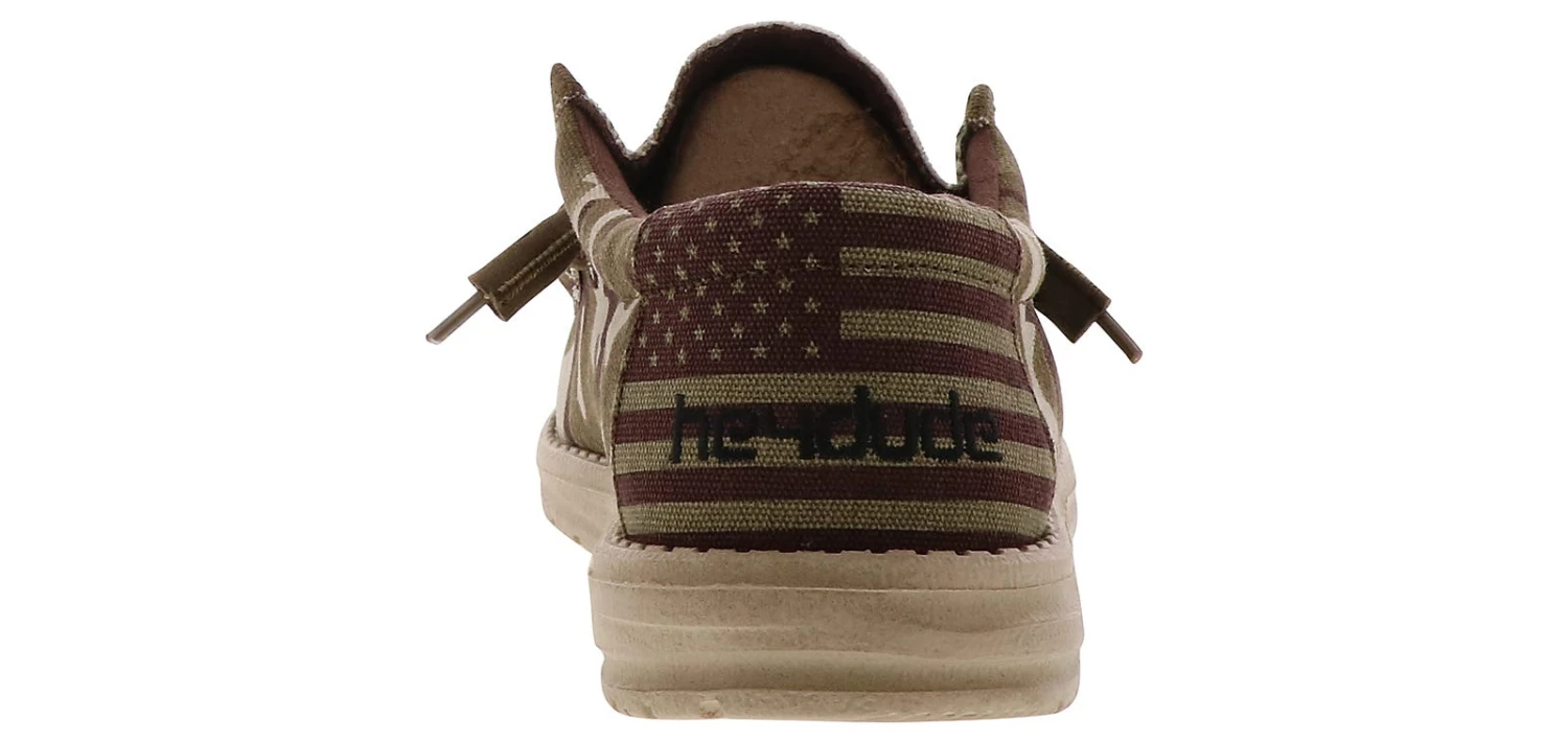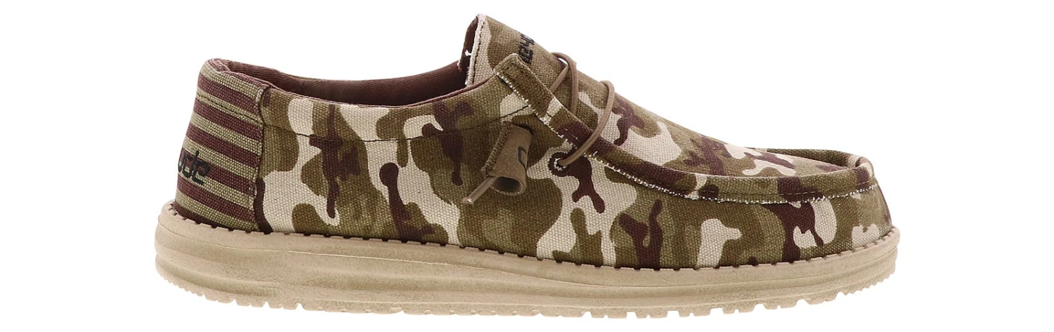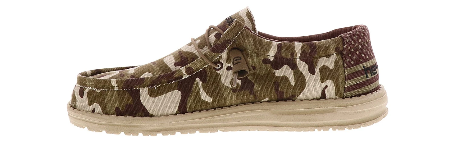 Complete your look with the Hey Dude Wally Camo Men’s Casual Shoe! The comfortable but lightweight shoe features a canvas upper and padded collar. The contrasting camo print and flag detail on the heel allows you to blend in and show off your american pride. You can slip into the shoe and be ready to go with the no-tie elastic laces. The lightweight EVA outsole is flexible and supportive. Show your pride in the Hey Dude Wally Camo Men’s Casual Shoe!