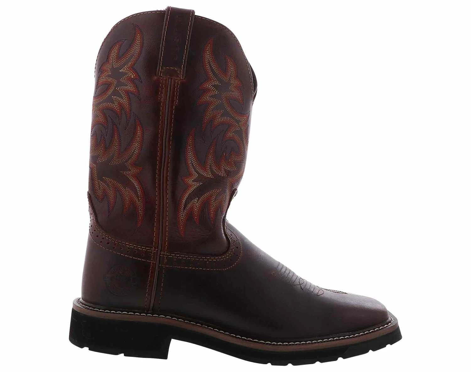 Get your work done in true cowboy style wearing Justin Stampede Men’s Western Boot! This durable boot features a brown leather upper with decorative stitching, a wide square toe, and long-base block heels for a comfortable fit. The J-flex comfort system insole absorbs shock, and the high-density performance rubber outsole delivers traction on a variety of surfaces.
