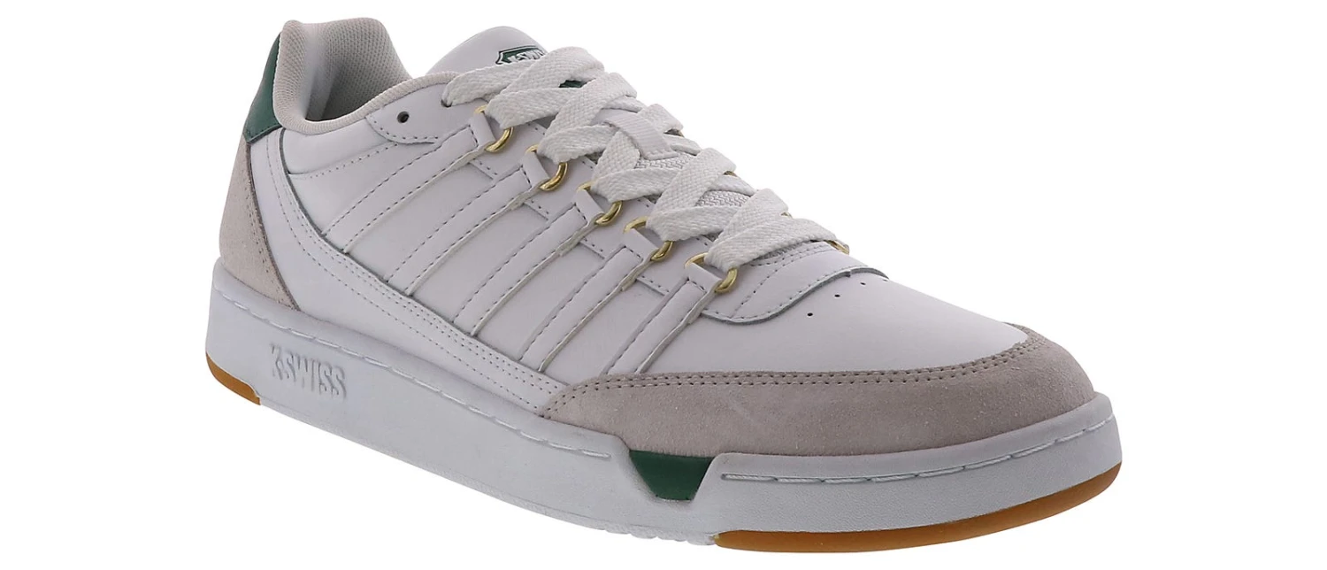 Start kicking it in the K-Swiss Set Pro Men’s Court Sneaker! This lace-up sneaker features a synthetic leather upper with gold eyelets. The rubber outsole ensures traction, while the cushioned insole provides comfort to your feet. Step onto the court with the K-Swiss Set Pro Men’s Court Sneaker!
