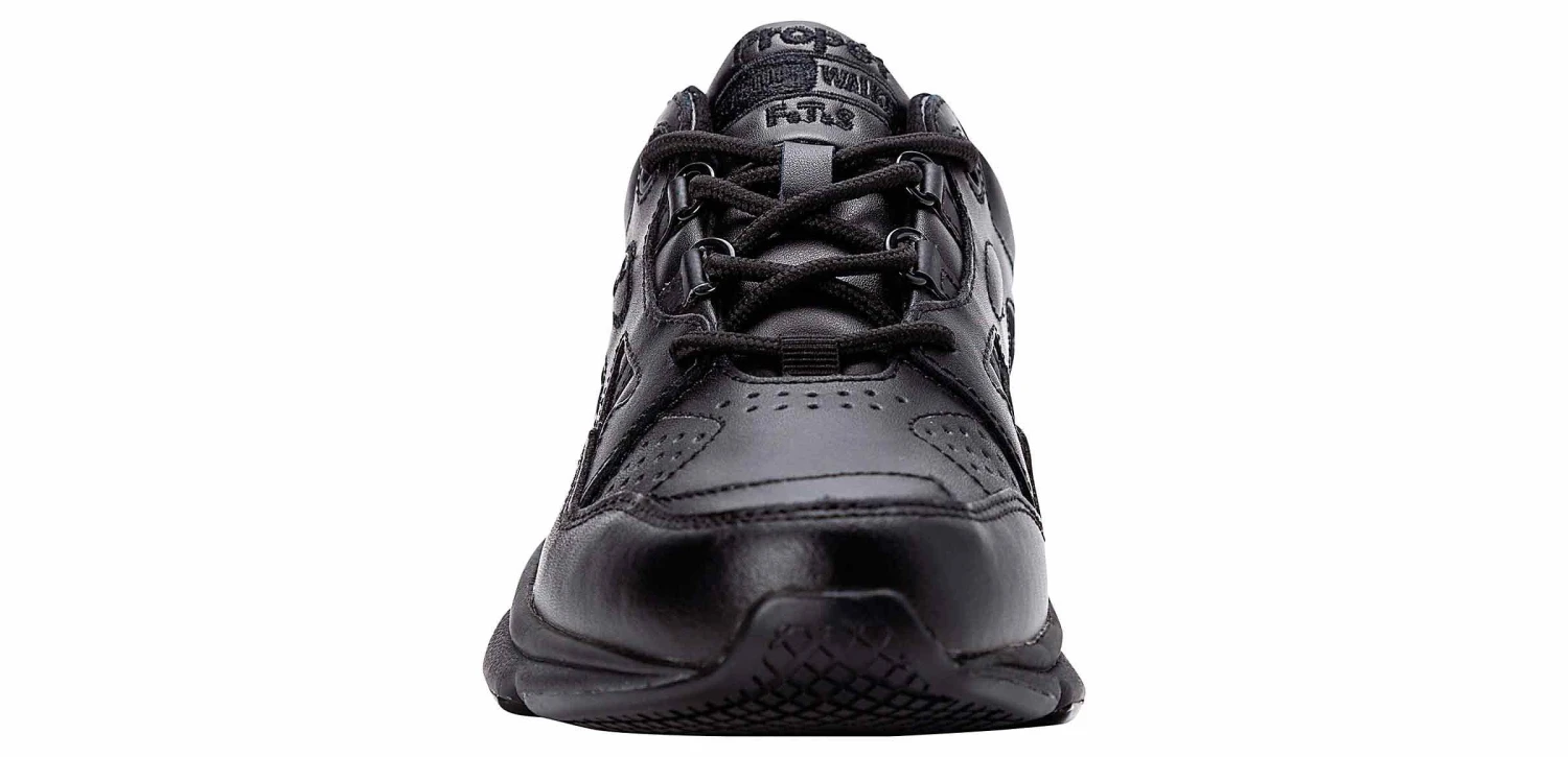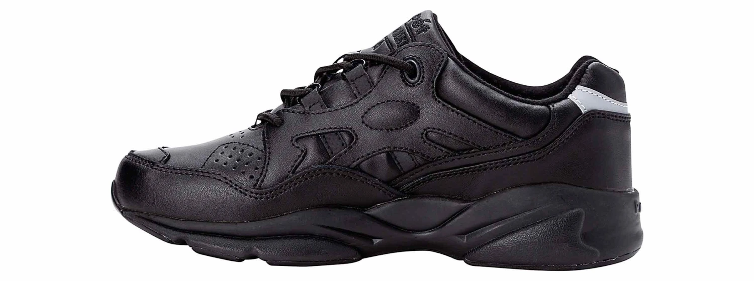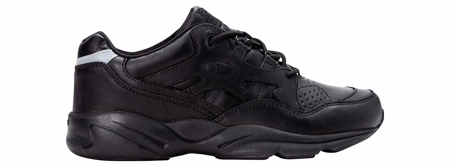 The Propet Stark Slip-Resistant Men’s Shoe has a leather upper body with a roomy toe box providing toes space to spread out improving stability. Soft cushioning faux leather for even wear with comfort ridges in forefoot and memory foam topper. Supportive EVA midsole with slip resistant rubber outsole for a long lasting smooth stride.