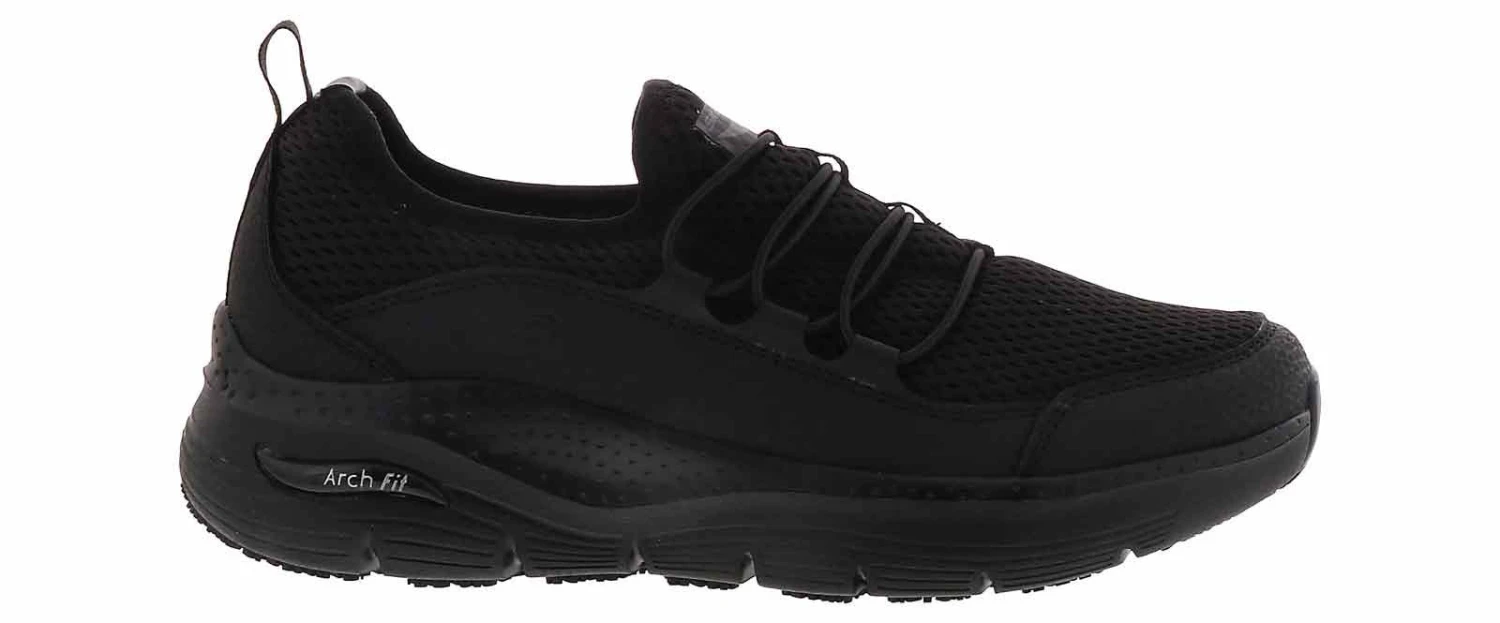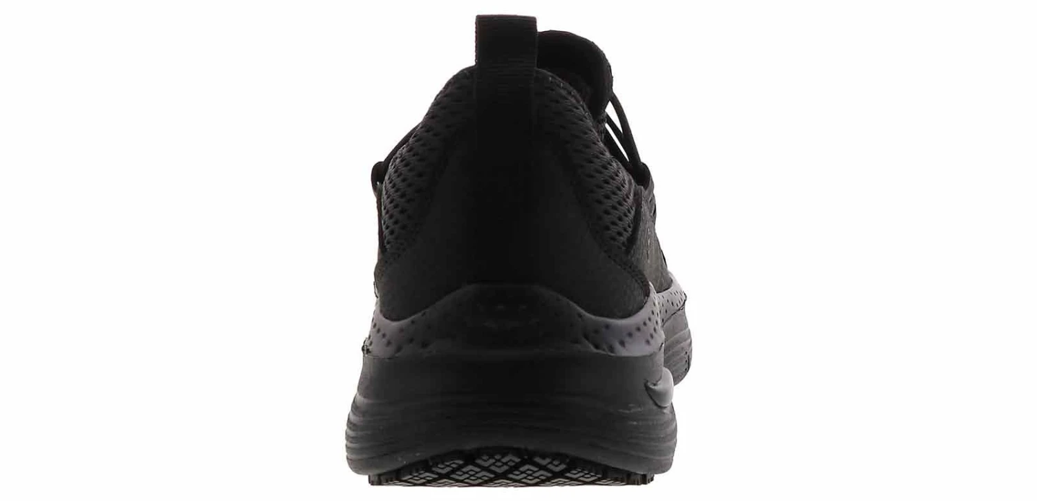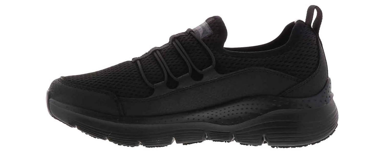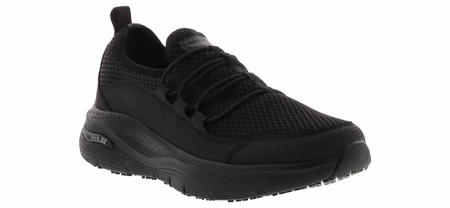 The Skechers Arch Fit Sr Jitsy Women’s Work Shoe has you covered! This all-black work shoe features a breathable mesh upper with a bungee-laced front closure. The iconic air-cooled memory-foam Arch fit removable insole provides extra comfort for all-day wear. No slips here with the slip-resistant rubber outsole. The flexible sockliner allows you to move freely from here to there. Feel safe and protected with the Skechers Arch Fit Sr Jitsy Women’s Work Shoe!