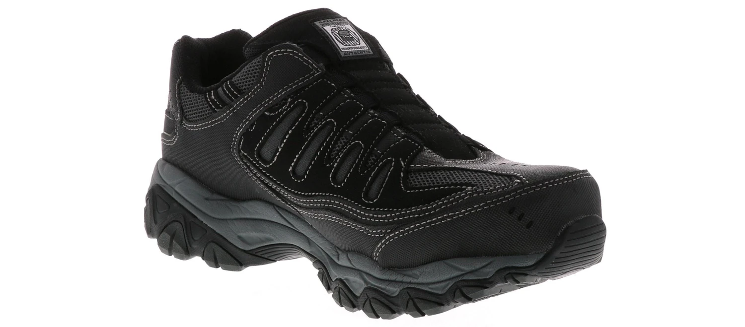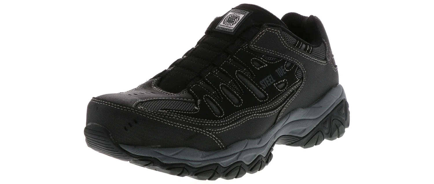 Take the easiest route to protection, comfort and style with the Skechers Work: Cankton – Ebbitt steel toe shoe. Durable leather, synthetic and mesh fabric upper in a slip on casual steel toe work sneaker with stitching and overlay accents. The Skechers Cankton Ebitt work shoes have a Memory Foam insole.