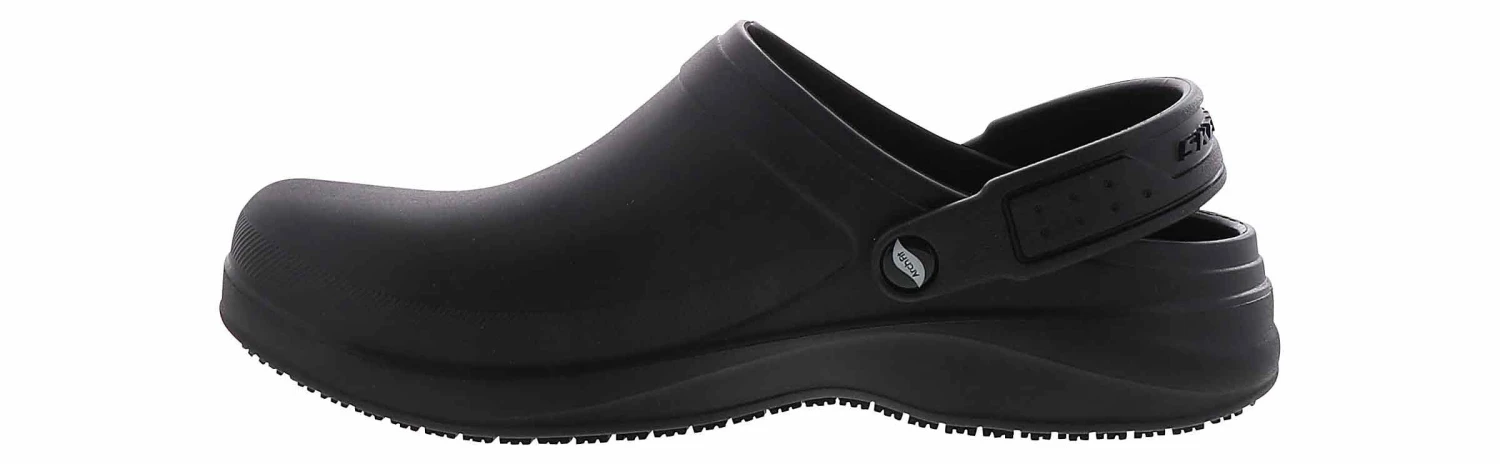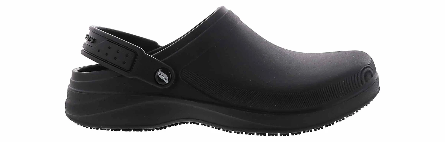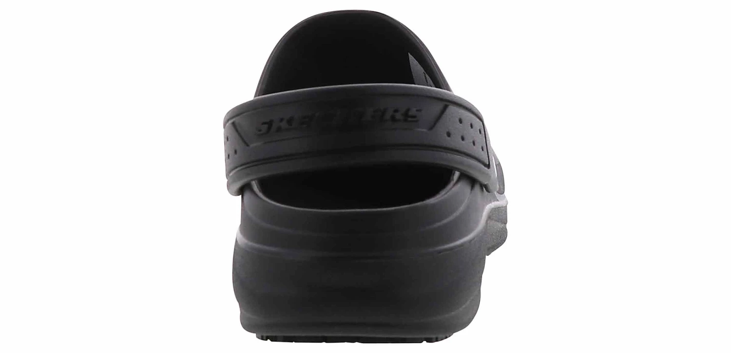 The Skechers Riverbound Men’s Slip-Resistant Clog is a breathable, work-safe style! This shoe has an EVA upper with a rotating heel strap for extra support. The open construction makes for an easy slip on and off, while the cushioned insole makes a comfortable fit while you’re on the go. The rubber outsole is slip-resistant to help prevent accidents on slippery surfaces. Stay comfortable and light on your feet at work with the Skechers Riverbound Men’s Slip-Resistant Clog!