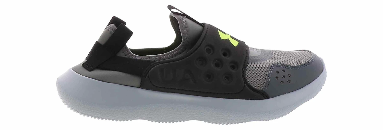 The Under Armour Runplay Boys’ Running Shoe is the perfect style he can slip on all by himself! This shoe has a breathable mesh upper with a midfoot strap for a secure and locked-in fit. The double heel webbing makes an easy on and off, while the cushioned insole delivers padding while he plays. The rubber outsole adds durable traction so he can stay on his feet all day long. Keep your active boy comfortable with the Under Armour Runplay Boys’ Running Shoe!